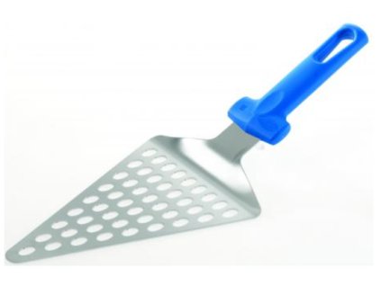 Nerezová trojúhelníková perforovaná lopatka určená pro servírování jednotlivých porcí pizzy.