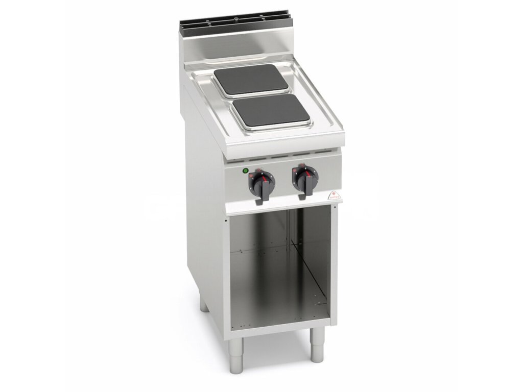 Pracovní plocha a opláštění z nerez oceli AISI 304. Litinová varné plotýnky s bezpečnostním termostatem a regulací výkonu. Kompaktní provedení s otevřeným podstavcem.
