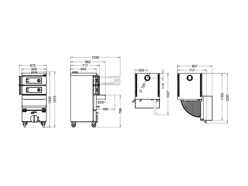 gratinování, regeneraci, zakouření a pražení. Topeniště je navrženo tak, aby pojalo 5 kg dřevěného uhlí, 7 kg palivového dříví. Vzduch pro spalování je regulovatelný a umožňuje tak použití různých druhů paliva: dřevo, uhlíkový koks a lisované cihly.