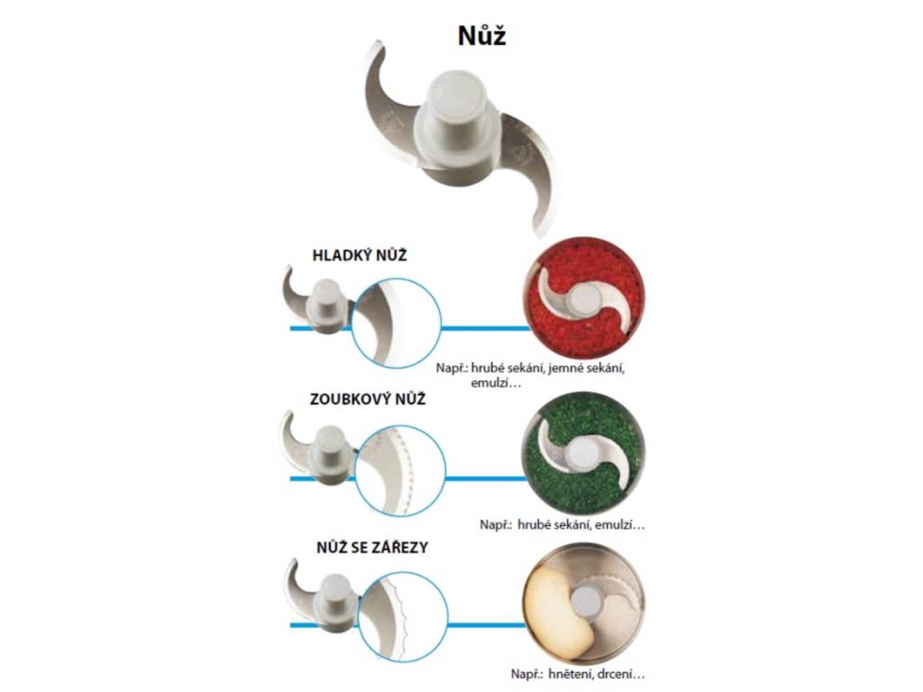 - Lze v ní sekat maso, zeleninu, mandle, oříšky, koření, připravovat majonézu, pyré, protlaky, pomazánky, strouhanku a hnětat těsto.