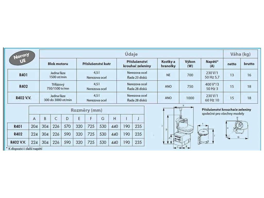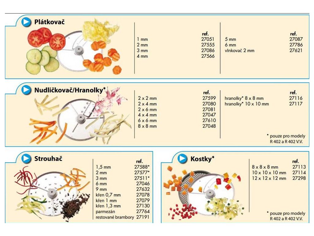- 1981 - pro R 401 sada 4 disků: plátkovač 1 a 3 mm, strouhač 1,5 mm. nudličkovač 4x4 mm - 6.130,-Kč bez DPH