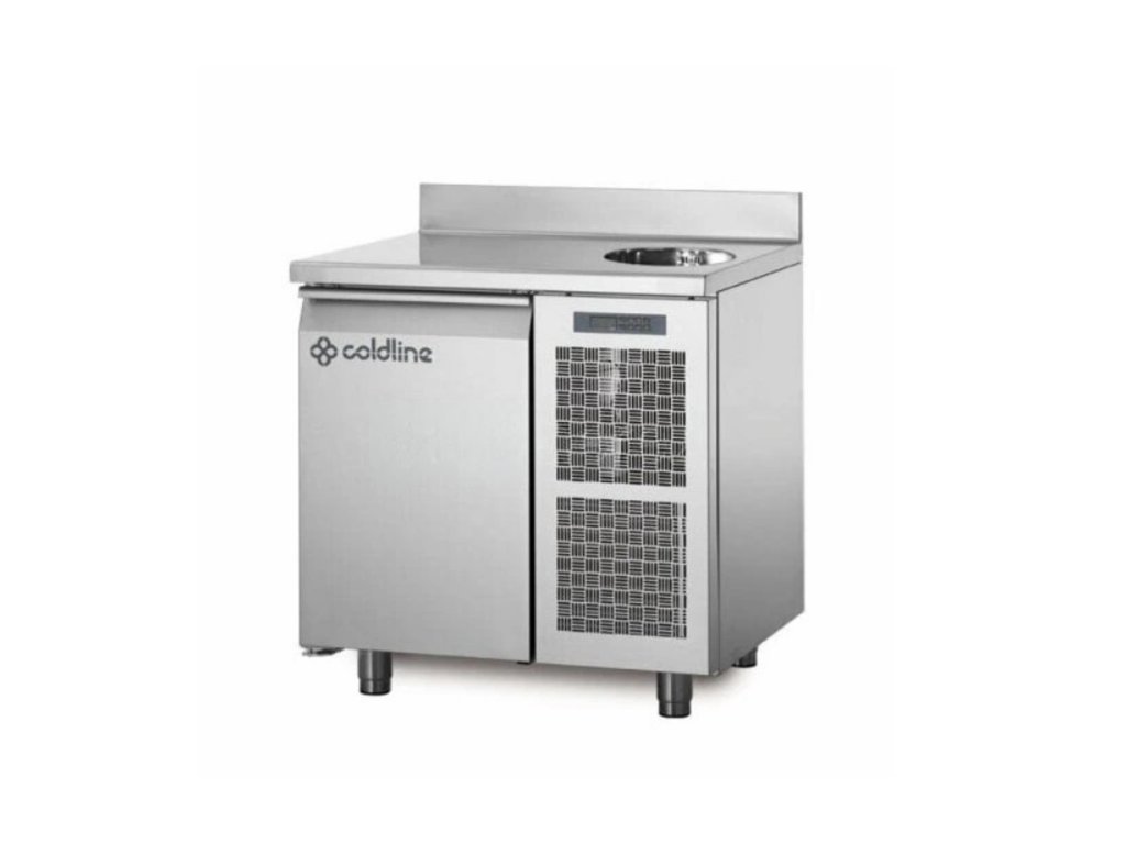 Chladiaci stôl Coldline TA09/1MS s doskou, drezom a zadným lemom (1x dvere / 820 mm)