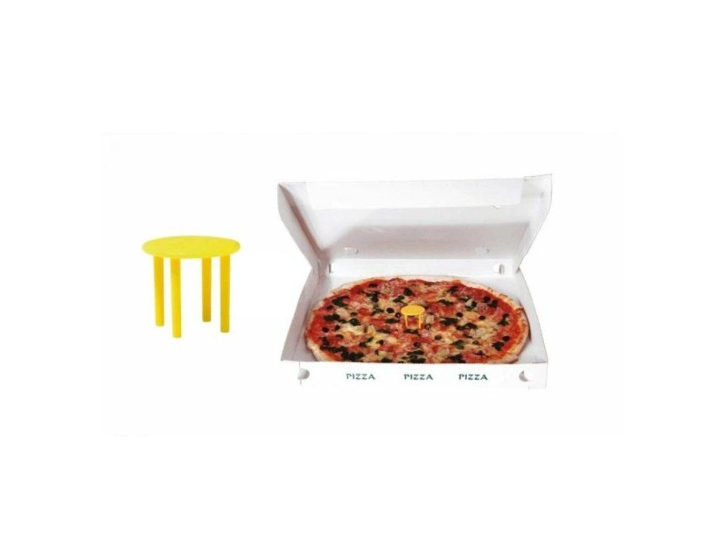 Plastový dištančný stojan do krabíc s pizzou, zabraňujúci nalepeniu syra na veko krabice.