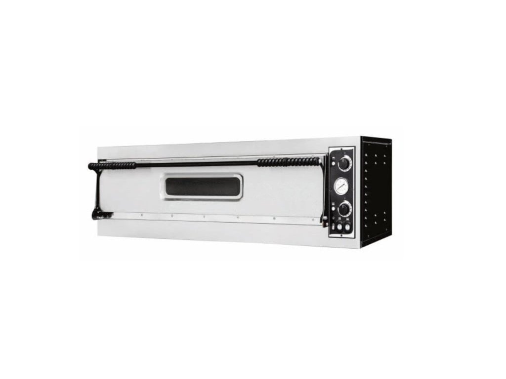 Jednokomorová "plytká-široká" elektrická pizza pece radu BASIC XL. Jednoduché a prehľadné mechanické ovládanie umožňuje individuálne nastavenie výkonu spodných a horných telies v komore prípadne vypnutie spodného alebo horného telesa. Pece sú vybavené analógovým teplomerom, a termostatom do 500 ° C, vnútorným osvetlením komory. Prevedenie s nerezovým čelom, kvalitnou izoláciou a opláštením v laku.