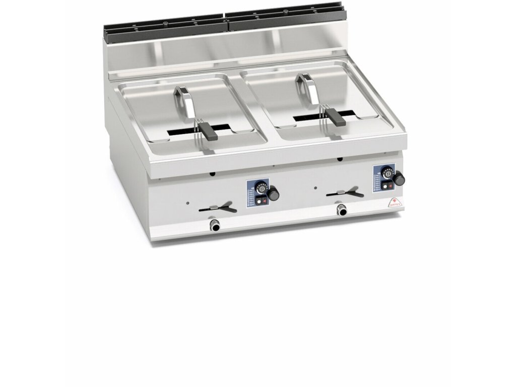 Plynová fritéza GL10+10B BERTOS má ovládanie teploty termostatickým ventilom od 110 ° C do 190 ° C s presným zisťovaním teploty vďaka senzorom vo vani. Bezpečnostný termostat s manuálnym reštartom. Plynová fritéza BERTOS je vybavená vypúšťacím guľovým kohútikom s tepelne odolným držadlom.