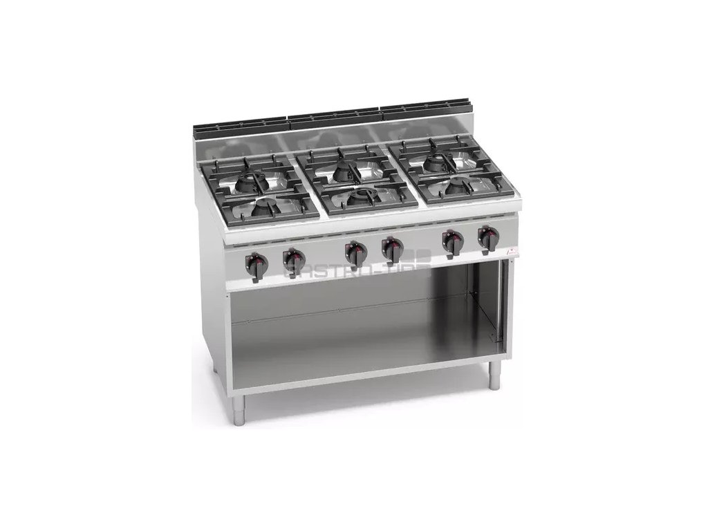 Pracovná plocha a opláštenie z nerez ocele AISI 304. Výkonné liatinové horáky HIGH POWER, ľahko demontovateľné a umiestnené vo vyberateľných prelisovaných smaltovaných (nerezových) odkvapových vaniach. Zapaľovanie horákov večným plamienkom. Kompaktné prevedenie s otvoreným podstavcom.