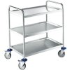 Vozík v nerezovom prevedení s 3 policami, štyrmi otočnými kolieskami (Ø100mm, 2x brzdená). Police s prelisovaným zdvihnutým okrajom a spodnou tlmiacou vrstvou.