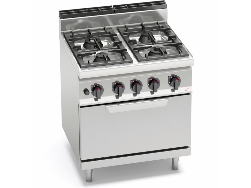 Plynový sporák s plynovou rúrou G7F4P+FG - t var liatinových roštov tvorí optimálnu pracovnú plochu pre jednoduchú manipuláciu s riadom. Silné liatinové horáky 7 kW zaručujú nadštandardný výkon a životnosť. Pracovná plocha a opláštenie z nerez ocele AISI 304.