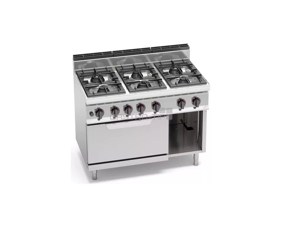 Pracovná plocha a opláštenie z nerez ocele AISI 304. Výkonné liatinové horáky HIGH POWER, ľahko demontovateľné a umiestnené vo vyberateľných prelisovaných smaltovaných (nerezových) odkvapových vaniach. Zapaľovanie horákov večným plamienkom.