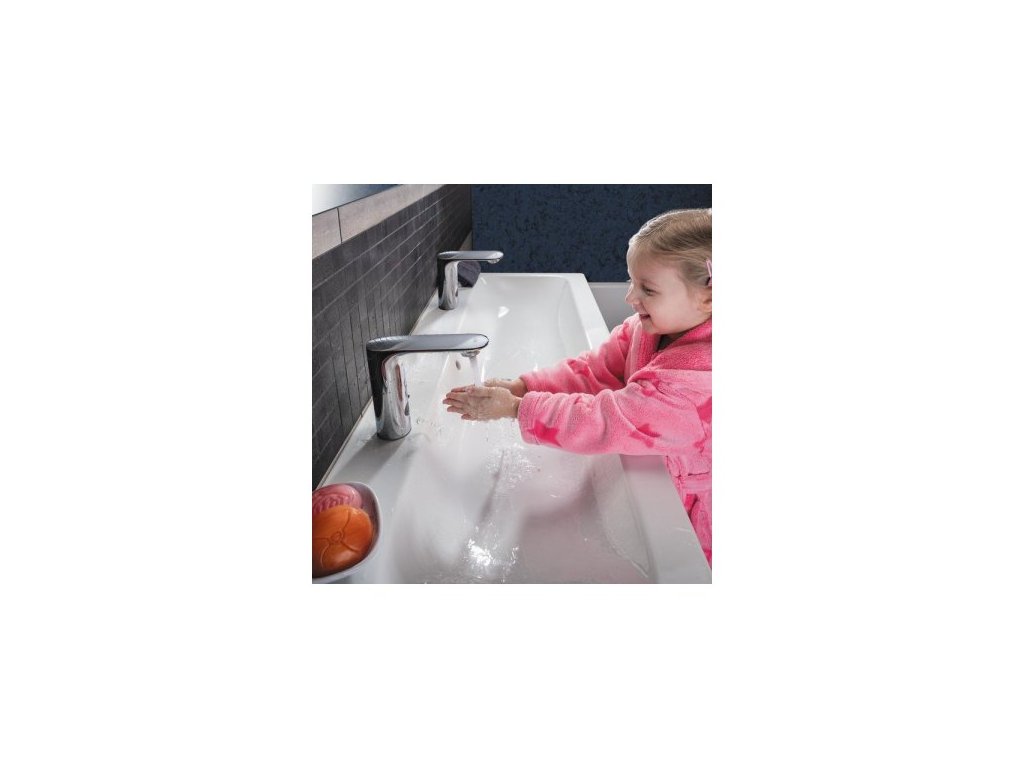 - reaguje na prítomnosť rúk v snímanej zóne okamžitým spustením vody
