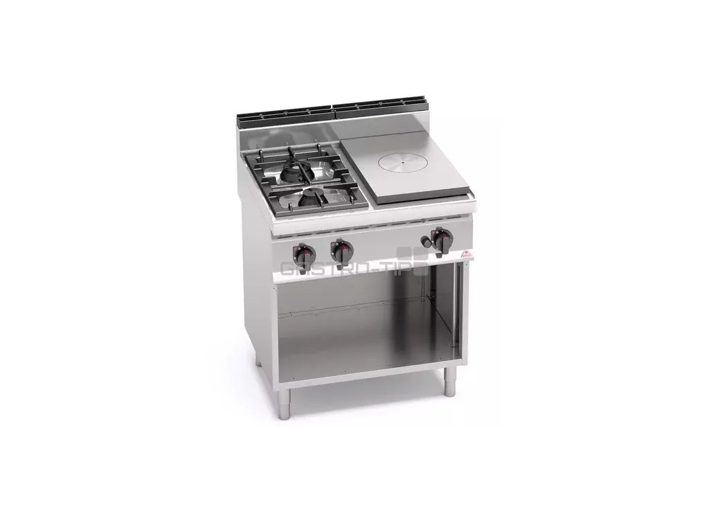 Plynový sporák s oceľovou platňou veľkej hrúbky s rozdielnymi oblasťami teplôt: max. teplota na strede, klesajúca na okrajoch. Ohrev zaisťuje stredný liatinový horák 7kW s reguláciou výkonu. Zapaľovanie horákov večným plamienkom. Kompaktné prevedenie s otvoreným podstavcom.