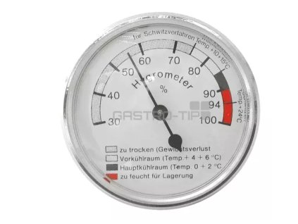 Analógový vlhkomer v plastovom puzdre s kovovým pochrómovaným rámčekom. Rozsah stupnice je 30 až 100% relatívnej vlhkosti .
