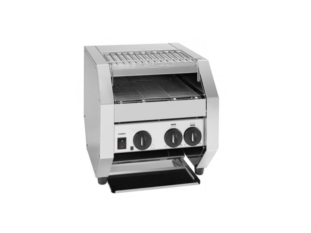 Tento profesionálny priebežný sendvičovač s dopravníkom ľahko opeká viac ako 900 plátkov toastov za hodinu a je ideálny pre hotelové raňajkové bary alebo raňajkové reštaurácie. Na jeho 37 cm široký dopravný pás sa zmestia vedľa seba 3 plátky, ale jeho 5,5 cm vysoký otvor pojme celý rad produktov, nielen plátky toastov, ale aj bagety, anglické vdolky, hrčky, toasty alebo žemle na prianie zákazníka. Tento sendvičovač môže dávkovať plátky spredu alebo zozadu na priložené žľaby (zadný výstup so špeciálnym žľabom na vyžiadanie).