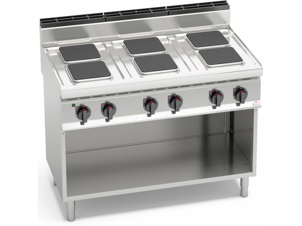 Litinové varné plotýnky s bezpečnostním termostatem a regulací výkonu. Kompaktní provedení s otevřeným podstavcem.