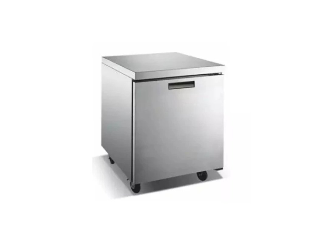 Stůl chladící pojízdný MTUC-27R v celonerezovém provedení s pevnou pracovní nerezovou deskou bez zadního lemu. Stůl je vybaven 4 otočnými kolečky (2x brzděná). Ventilované chlazení, mechanický termostat pro nastavení požadované teploty. Teplotní rozsah 0/+10°C. Celkový rozměr (šxhxv): 690x750x900mm, obsah 180L, počet dveří/polic : 1/1