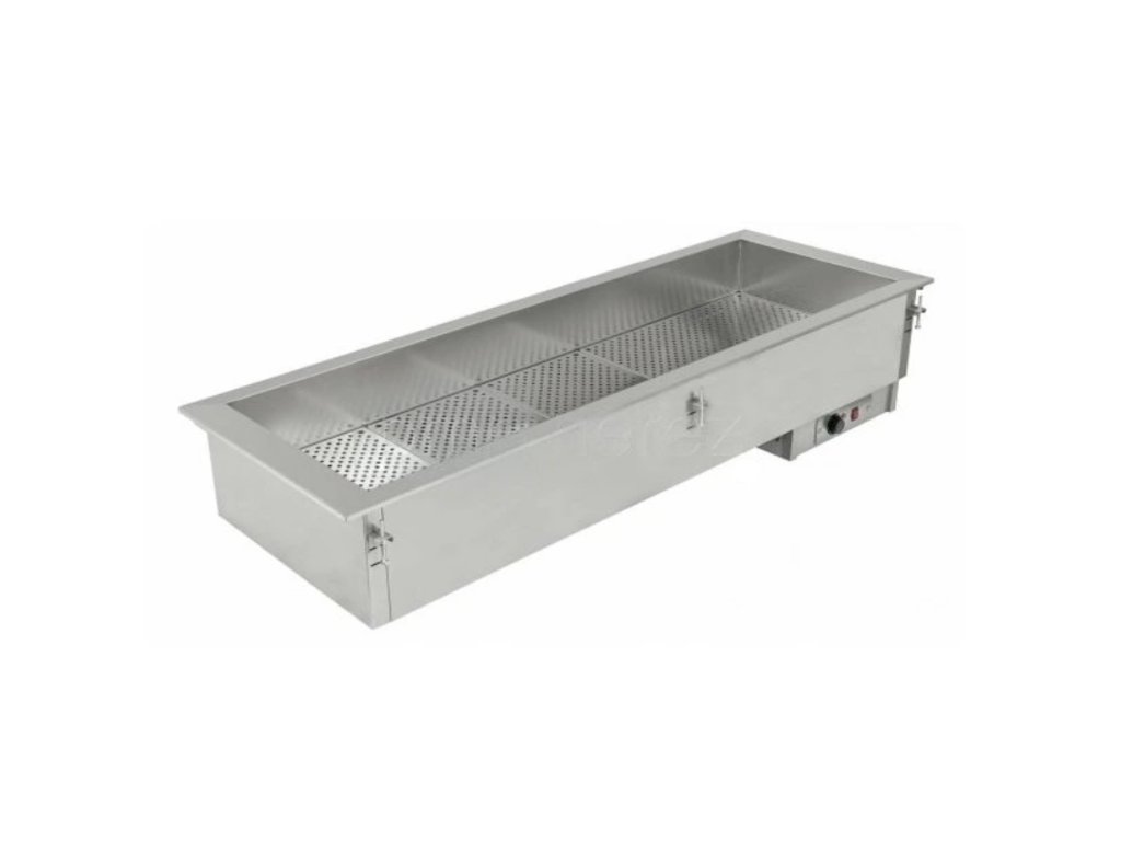 - Vestavná teplá vana (suchý statický ohřev bez vody) je speciálně navržena pro uchovávání, prezentaci a distribuci teplých potravin uložených v hlubokých nerezových GN (dodávány volitelně).