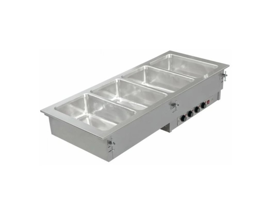 - Vestavná vodní lázeň - dělená je speciálně navržena pro uchovávání, prezentaci a distribuci teplých potravin uložených v hlubokých nerezových GN (dodávány volitelně).